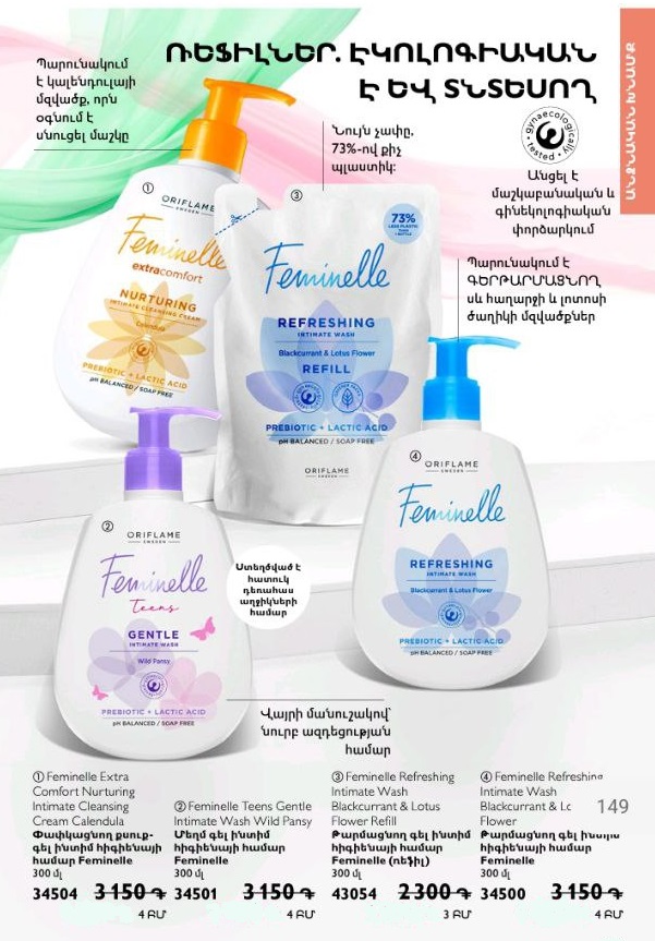 Oriflame Feminelle Refreshing Intimate Wash – کد 34500 یک ژل شستشوی بانوان است که مخصوص بهداشت و مراقبت از ناحیهی حساس بانوان طراحی شده است. این محصول روزانه بهکار میرود و با فرمولی ملایم، پاکسازی و تازهسازی را بدون خشکی یا تحریک پوست انجام میدهد.